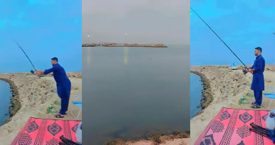 Fishing at Raysut Beach Salalah спокойная береговая рыбалка на фоне портовых кранов и кораблей