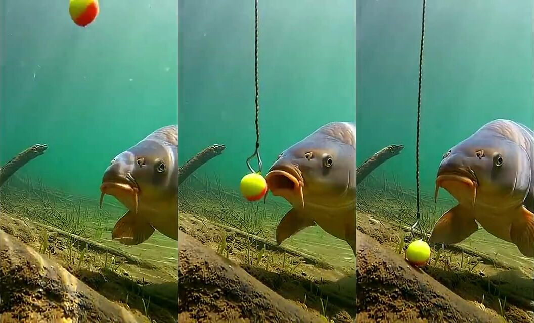 Подводная поклевка заснята идеально на камеру, видно как крупная рыба хватает приманку у дна
