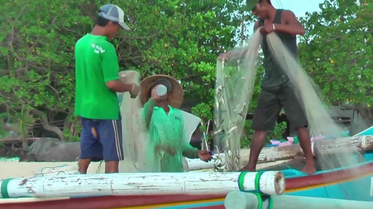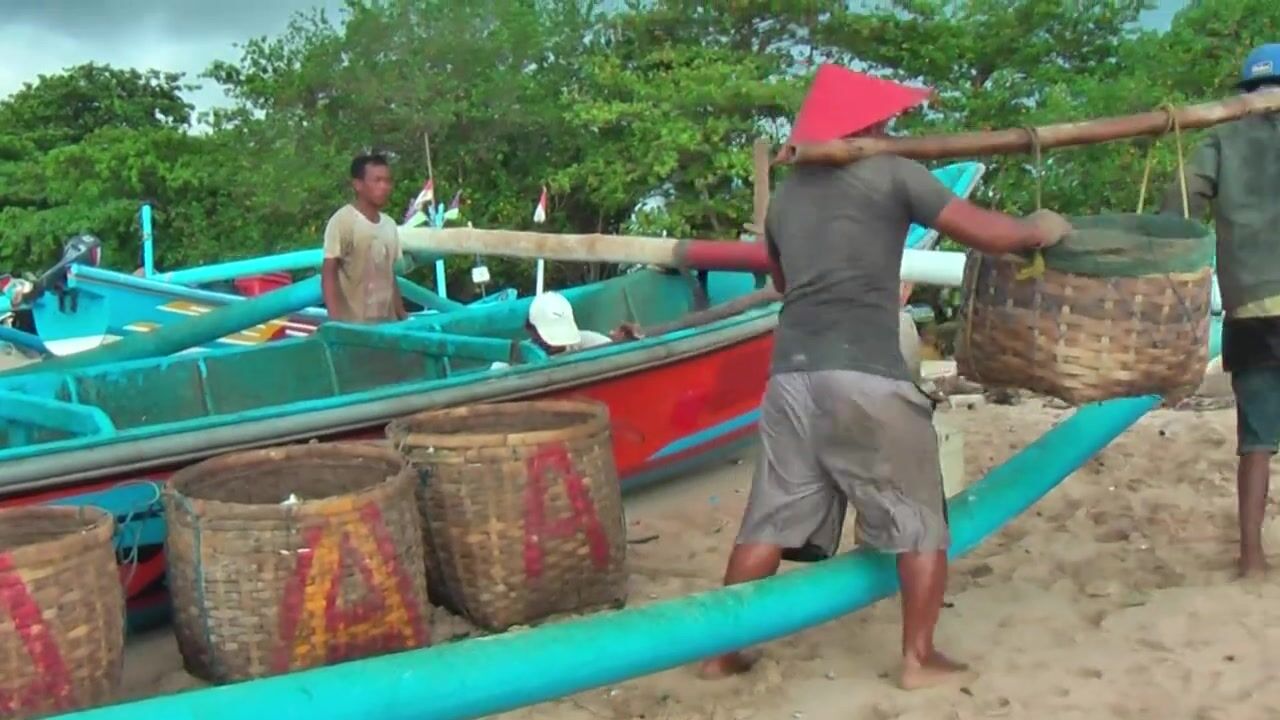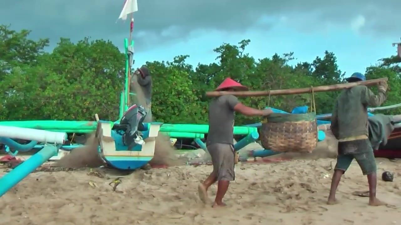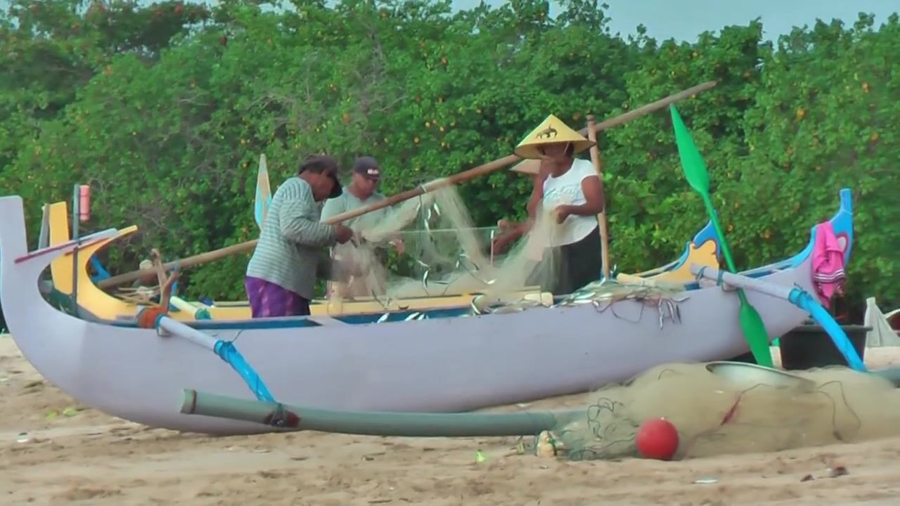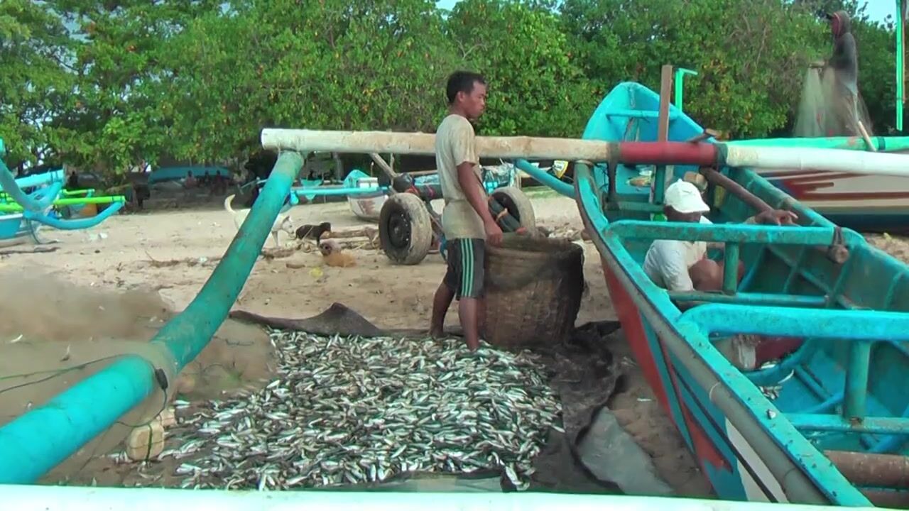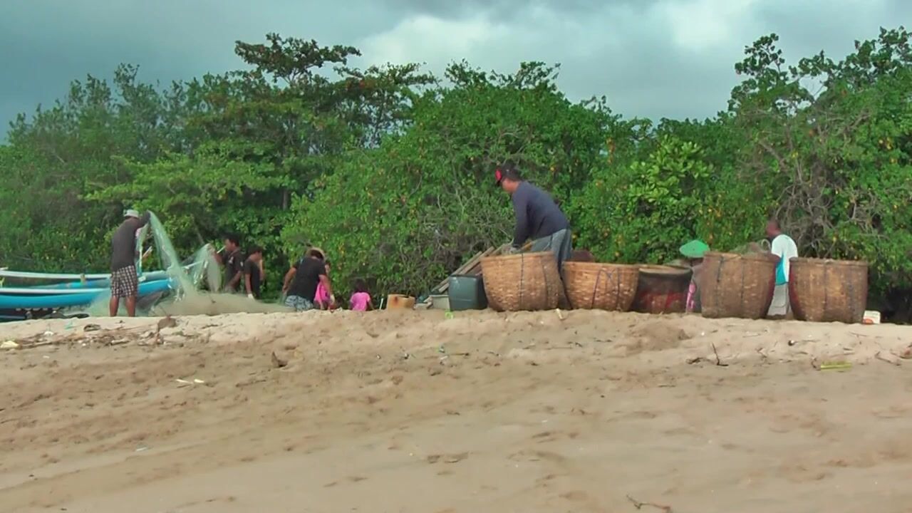 Рыбаки Jimbaran Bali живут и работают прямо на пляже от сети до вечерней рыбалки