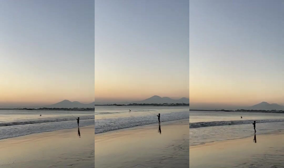 Ребёнок с удочкой на Jimbaran Beach Bali первая береговая рыбалка и следы на тёплом песке