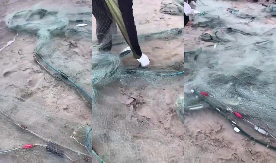 Рыбаки на пляже вечерний улов сети лодки и закат над морем