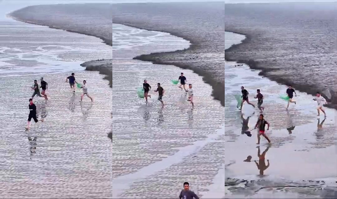 Рыбалка на приливе в устье реки Qiantang Zhejiang огромная волна и осторожные забросы у кромки