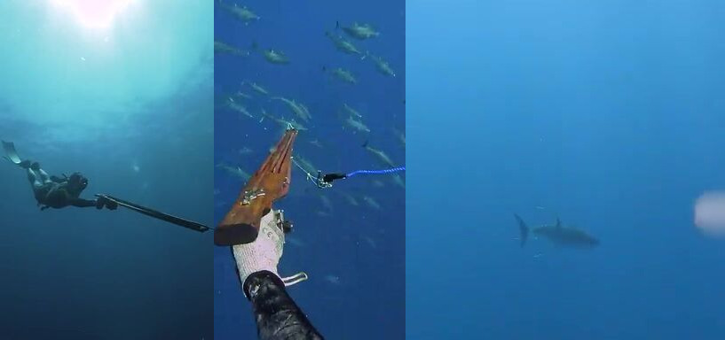 Подводная охота на монстр тунца на Бали мощное вываживание в синем океане