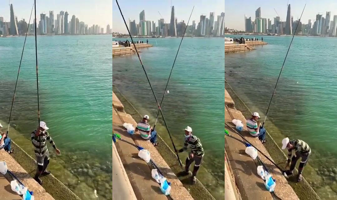 Рыбалка в Катаре местные рыбаки их снасти и уловы у каменистой косы на закате