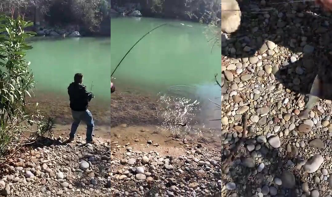 Радужная форель в Alara Çayı Alanya речная рыбалка в горном ущелье среди скал и сосен