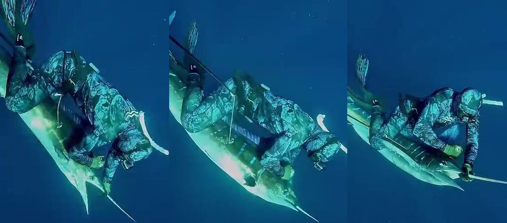 Мы час бились с рыбой меч в океане тяжёлая морская рыбалка для всей команды