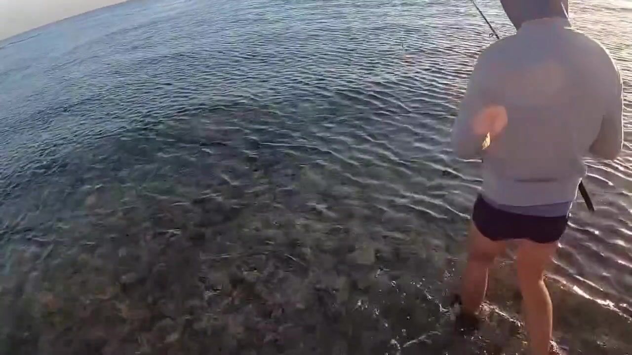 Первая проводка - удар, пусто, вторая - ещё удар, третья - визг фрикциона. Поведение как литл туна, идёт дугой. Держу низом, качаю коротко. На развороте рыба встаёт, потом бросок в кромку - подрезало флюр о коралл, бахрома, сход. Меняю моментально лидер на 0.70, узел FG, контроль на растяжение. У Макса параллельно серия поклёвок, Ваня говорит по верху кипит мальок.