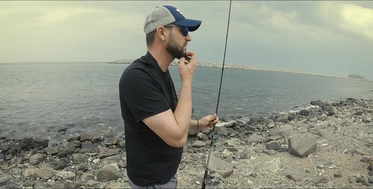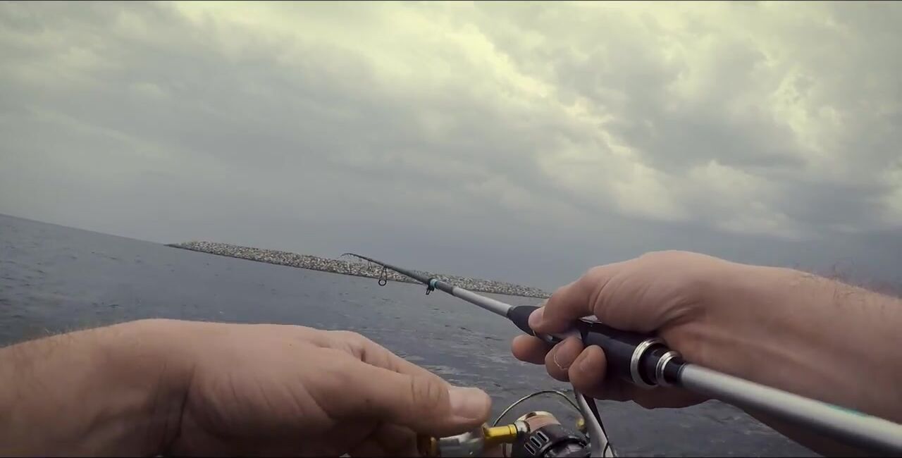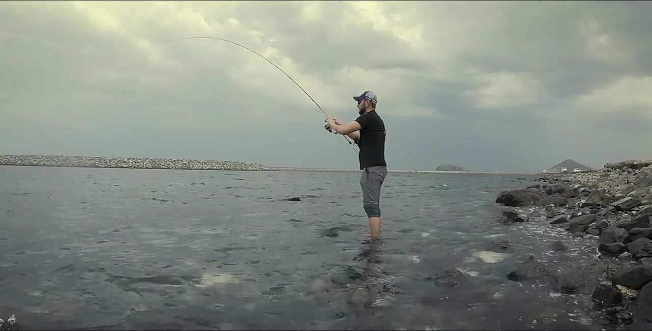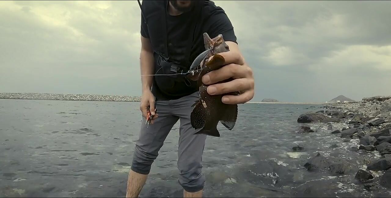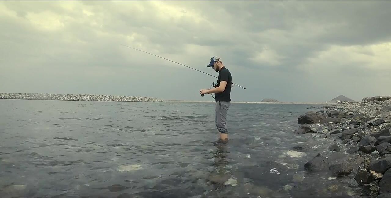 Один в Диббе, захожу на «семейный» пляж, начинаю мягким ритмом, восемь грамм. Первый морской окунь, не спешу — под камнями жизнь кипит. Между скалами подсвечиваю, вывожу, чтобы не застрял, перчатки выручают. Есть активный окунь крупнее, меняю место: там ветер и вспышки молний, ставлю «приюки пятьдесят с». Рыба прячется в камни, дождь сгущается, гроза на подходе. Про снаряжение и приманки обещал расписать отдельно, сворачиваюсь до удара грозы.