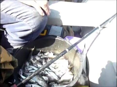 | По кадрам | Люди на борту, удилища в работе и мелкая серебристая рыба в кокпите |