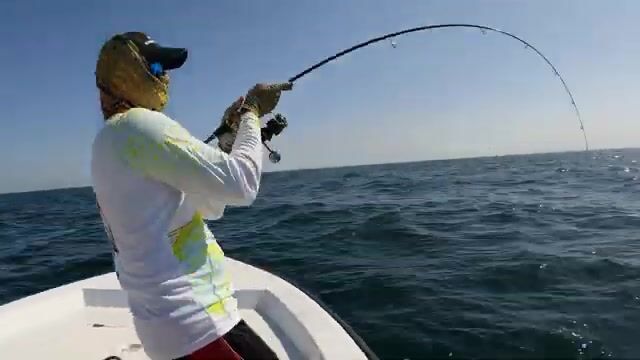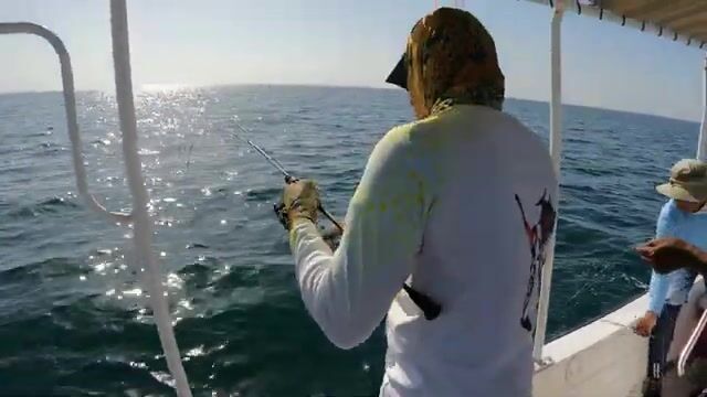 Большого kingfish пришлось качать без резких рывков: поднял, опустил, снова выбрал слабину. Рыбалка в Абу-Даби с катера шла на полный день, цель была простая - найти kingfish. Сначала был первый удар, потом поиск baitfish и выходы рыбы вокруг лодки; Jim довёл рыбу перед бортом, Mohana помог принять её уже у лодки.