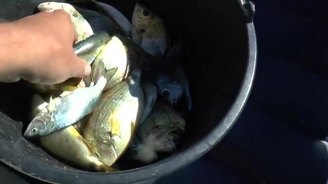 По рыбе в ролике есть ласкирь, луфарь, ставрида, морской окунь, каменщик и ерш; итогом набрали 16-литровое ведро. Сначала мешала ставрида и леска, потом поставили самодельную оснастку с тремя крючками и мушками, отдельно сработал кальмар на насадку. Запас поводков, готовые ставки и кальмар тут не лишние: на Немецкой балке сначала надо найти рыбу по эхолоту, иначе лодку можно долго крутить по пустой воде.