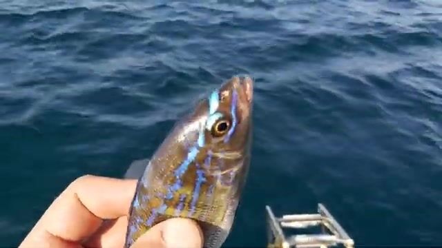 Голубой окунь показал, что точка сработала, даже если размер пошел обычный. ROMARIO SEVAS снял короткую рыбалку в Крыму с катера: море спокойное, на борту двое, по старой карточке катер Одиссей 530 с мотором 90 л.с., ловят черноморского окуня, правильное название в ролике - смарида.