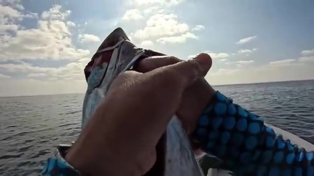 Основная поклевка случилась после поиска стаи: на 5:48 снасть загрузилась уже по-настоящему, дальше вываживание, борт и финальное взвешивание. Точную цифру на весах не беру - 60 kg здесь звучит как цель выхода, а не как названный результат. По снастям я бы уточнил размер попперов, запас флюра и кто принимает тунца у борта: на такой рыбе лишняя минута быстро съедает руки.