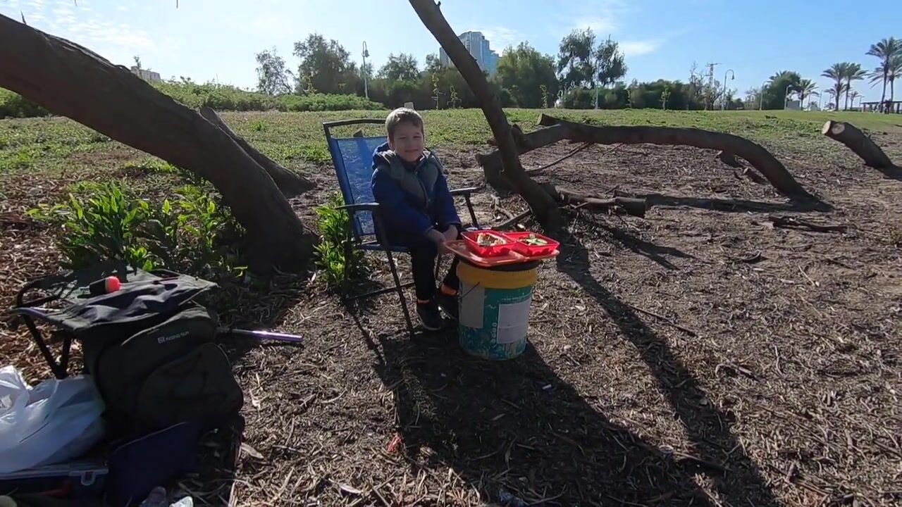 Приехал к Лохиш с внуком, он уже обедает. Поставили удочки на мелочь, берег удобный, трава и кусты вокруг. Есть утки — значит и рыба рядом. Видели цаплю и птичку рыболова, она зависала и промахнулась. Ричард поймал своего и теперь ест.