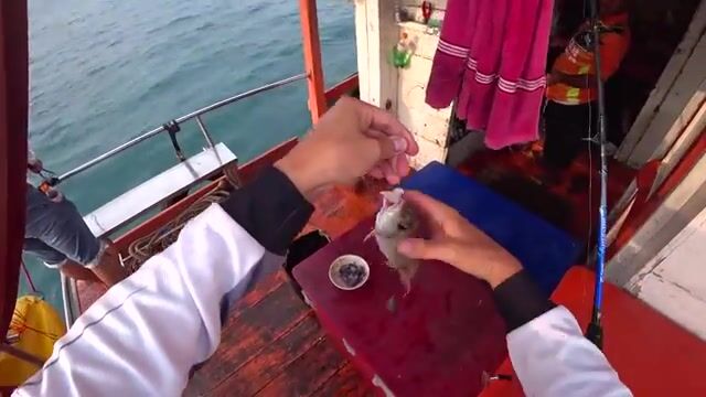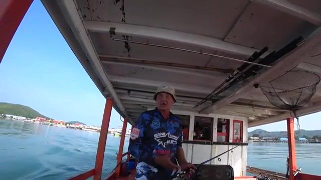 По открытому source подтверждены донки с грузом 50 грамм и двумя крючками на кальмара, троллинг на переходах и отдельная постановка спиннингов с живцом в зоне крупного хищника. Группа заявлена до 12 человек, цена в ролике названа прямо: 1800 бат за рыбака и 1300 за пассажира. Главным уловом автор выносит морского окуня, но точные веса и глубины в карточку я не добавлял, потому что source их не фиксирует.