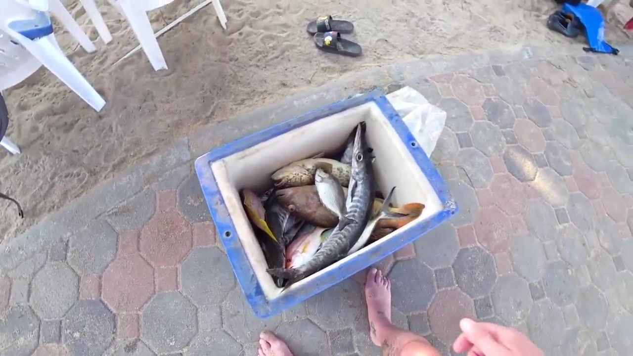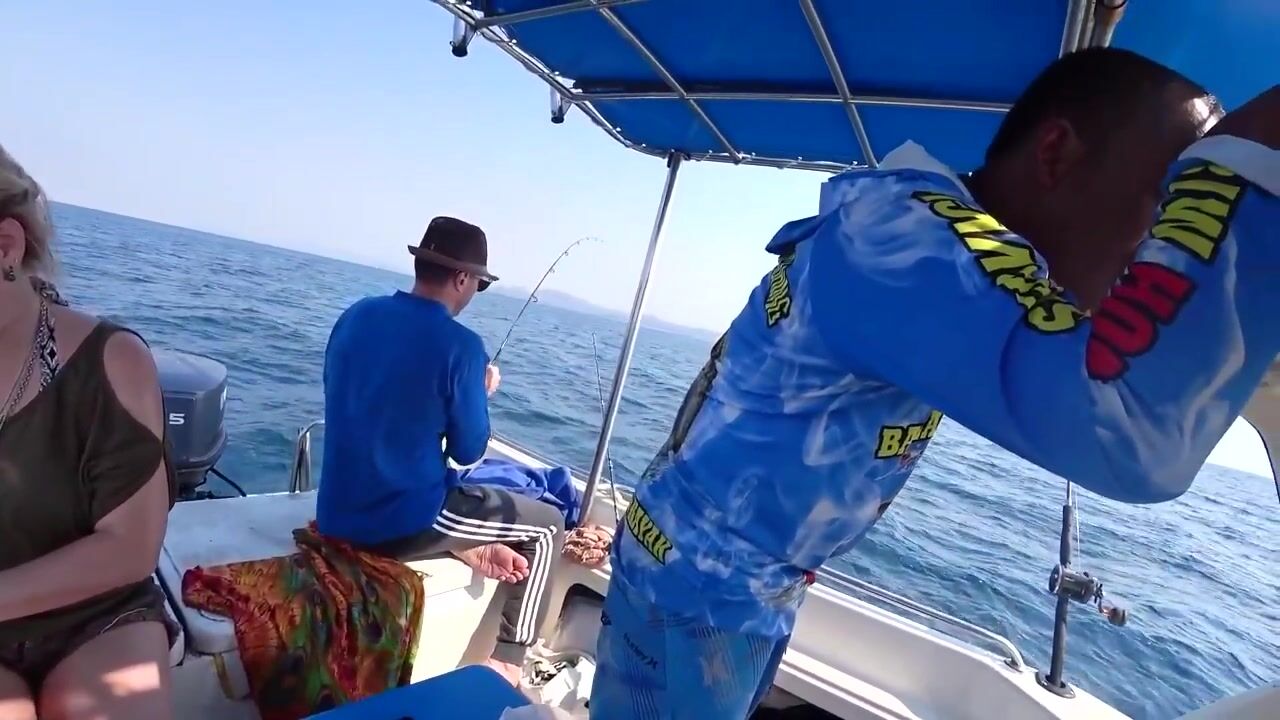 Часов через два ближе к рифу начались нормальные удары. Артур тащит что-то тяжёлое, думали зацеп, но пошло в сторону. Вышла барракуда, зубастая, килограмм 5-6. Подвели к борту, подняли багром. Рыба злая, бьётся, пришлось держать полотенцем. Сфоткались, потом почистили прямо на катере. Остальную рыбу - около двадцати штук, в основном мелкий окунь и пару снэперов. Всё на кальмара и куски рыбы.