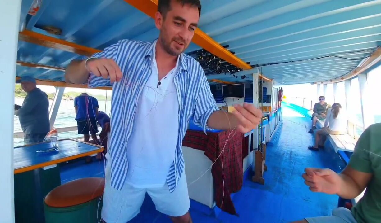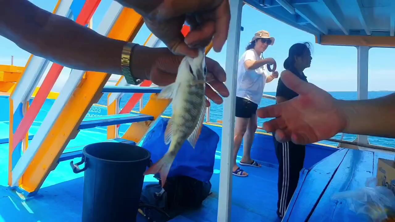 Дальше заминка - у Матвея морская болезнь, его укачало, лежит вдоль лавки, спасают ромом и второй таблеткой. Мы не останавливаемся. Под рифом сработала оснастка дропшот 18 г - два подряд рыбца, один снэпер полосатый, второй окунь бурый. Сосед ругается на натяжение - леску перетянул, треснул флюр. Я ставлю струну 20 см - пошла фуга, два среза до этого хватило. Фугу руками не трогаем - яд, кусачки и релиз.