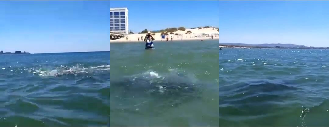 Анапский дельфин охотится у берега туристы смотрят